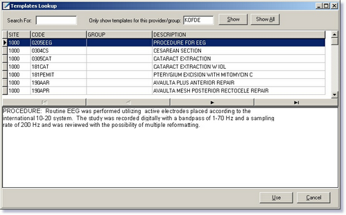 | 1. | From either the ChartNet Editor or the M*Modal Editor, use the shortcut F8 to open the Templates Lookup window. You may also open the Templates Lookup window by navigating to Insert --> Template. Reference the section Templates Lookup Window to learn more about the options contained in the Templates Lookup window. |