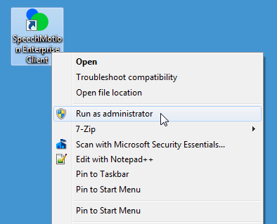 What to do if you have problems completing the SpeechMotion update: There are a few ways you can launch SpeechMotion with elevated privileges. · Right-click on the SpeechMotion icon and select “Run as administrator”.