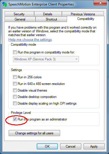 · If the option above is not available, right-click and select “Properties” and select the “Compatibility” tab. Check the option “Run this program as an administrator”. Click Apply and OK and try launching SpeechMotion again.