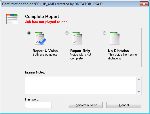 Changed: Simplified transcription work pool module with fewer promptsMany changes to how the transcription module loads jobs and prompts when jobs are complete. 1. When completing a report, the report and voice job is returned within the same action. Users are no longer required to enter passwords twice. 2. The “Complete Report” dialog automatically displays