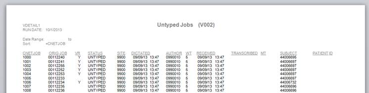 4. Notes added to the voice job in Voice Manager are passed to the Report document as well as displayed in the “Complete Reports” dialog. Changed: Password prompts are no longer required to complete a voice jobUsers previously had to type in their password twice, once for the report and again to mark a voice job “Complete”. This is no longer necessary. Only completed reports require a password confirmation. Changed: VR Drafts now display in report Transcriptionist Daily Log (D002)Transcription related management reports now correctly include VR drafts edited in the transcription module. When users ran Transcriptionist Daily Log (D002) it returned a list of reports transcribed by the user. Previously, VR jobs were transcribed by the VR service “ZMM1” and would not show up in the daily log because the user was not the scribe. This is no longer the case. VR Draft reports created in the new Transcription work pool module correctly record the MT as the scribe. Note: Pre-existing VR Drafts edited in the Review Edit module are not included. Changed: Report: Untyped Jobs (V002) report now includes VR jobsUser running this report to see how many jobs are left untyped no longer have to run a separate report to list VR Jobs in VR_DRAFT queue.