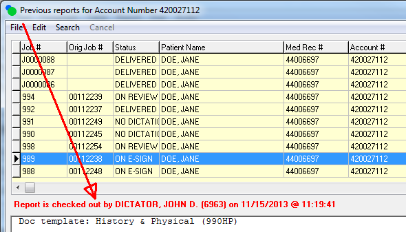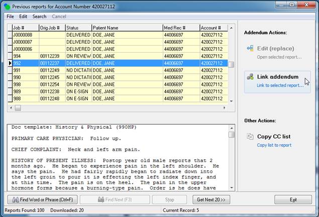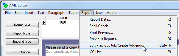 Edit Previous Job/Create Addendum report option Users previously used Previous Reports…(F6) option to look up the parent report of an addendum. This option prompts the user to select a search type. The new option (Ctrl+F6) skips the search prompt and automatically queries reports matching the same account number. If the account number isn’t available, it matches MRUN. If MRUN isn’t available, it searches by patient name.