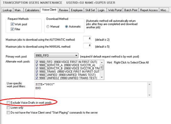 Workflow Server Added: Voice pool NO_DRAFT optionTranscriptionist not trained in Voice Rec Editing have a user option that excludes voice drafts from routing to them via work pools. When enabled, all work pools assigned to the user will exclude Voice Drafts. However Voice Drafts can still be assigned manually using the Voice Manager. Use this option when MTs are transitioning into VR editing.