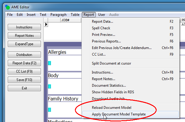 Fixed: Name and Address on RDS disappearsChanges to address fields were lost in specific circumstances. When users open new reports before editing the body of the report, if they enter an address in the CC list prior to filling in the name and address box on the RDS screen and then fill in the name and address box, Save (F10) and begin editing the body of the report. When returning back to the RDS the address entry is missing. Address entries in the RDS are now correctly saved. Fixed: Edited changes are lost when splitting jobs in AMEIn very extreme circumstances, MTs could experience a loss in edits when working with a high number of split jobs when opening, editing and closing reports rapidly. This issue has been resolved Fixed: Errors when splitting reports in AME after changing formsWhen splitting documents in AME, changing forms could generate a “missing field” error. These errors were generally harmless. Clicking through them would allow the report to continue saving. Issues with form field requirements were resolved. Added: Changing forms also changes associated document modelChanging the job’s Form Type will now reapply the correct Document Model to the displayed report. Creating a new report with no associated voice job (auto-job) will load the Document Model configured on the Form Record. Loading of Document Models occurs automatically. There are some cases, however, when the user will want to use the following menu commands: ·