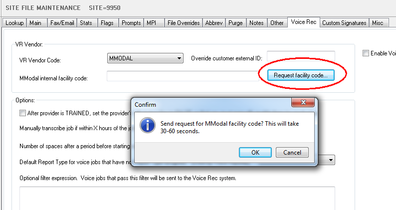 When clicked, all document models for the site will be updated. Note: Previously, a list of valid document models was maintained in the System table under the WorkTypes tab. This is no longer the case. Document Model lists are now maintained in the Site VR tabs. Added: Register sites to MModalPreviously, voice jobs had to be submitted to MModal to register new sites for use with AnyModal Console. This is no longer required. The VR tab includes a site registration request. Once this is clicked, it is recommended you close out the site record to unlock it for updates once the response is returned. Note: Site does not have to have VR enable to make use of this configuration.