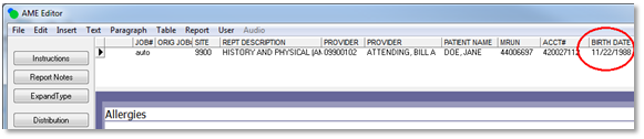 Note: If no CC recipients or ad-hoc distributions exist on the original report, the options will be disabled since there is nothing to copy to the new report. Changed: Birth date added to editor header gridWhen editing, the Report header grid now includes the patients birth date.