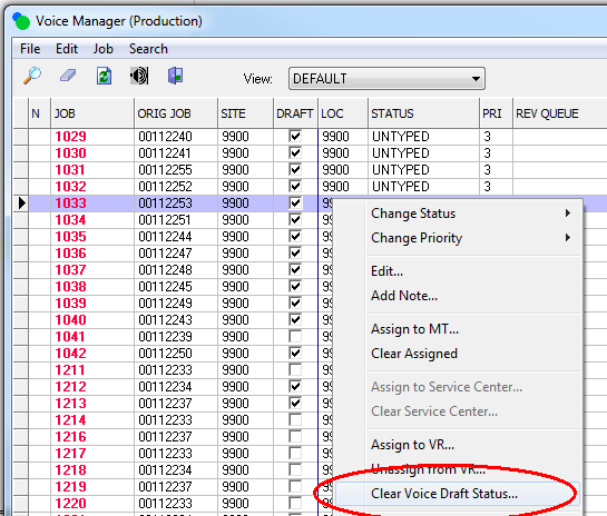 Added: Clear Voice Draft StatusUsers wishing to remove the voice draft document associated with a dictations can now do so in the Voice Manager. Once cleared, the job remains in status UNTYPED until it is checked out. The draft document will not be loaded in the transcription module. Billing and payroll with calculate the job as if was transcribed manually. Clearing Voice Draft Status of a dictation is allowed when: · Job is not assigned or checked out · Job is untyped · Job currently has a draft