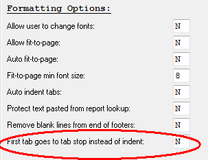 Workflow Server Fixed: Issues with tabs and hanging indentsAdded a form option ‘First tab goes to tab stop instead of indent’. This is on the Misc tab of Forms File Maintenance. When set to ‘N’, the default, the first tab in a paragraph goes to a hanging indent in a line if one is set. When the setting is to ‘Y’, the first tab in a paragraph goes to the first tab stop on a line instead of the hanging indent (This was the behavior of SpeechMotion prior to version 5.4.)