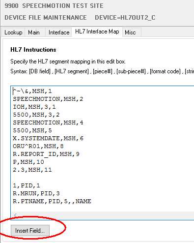 This should no longer occur. Fixed: Insert Field button when mapping device configThe Insert Field button on the mapping tab in Device File Maintenance should work correctly now. Will not insert bracketed field markers only the field text and cursor will not move to the end of the line it will move to the end of the inserted field. |