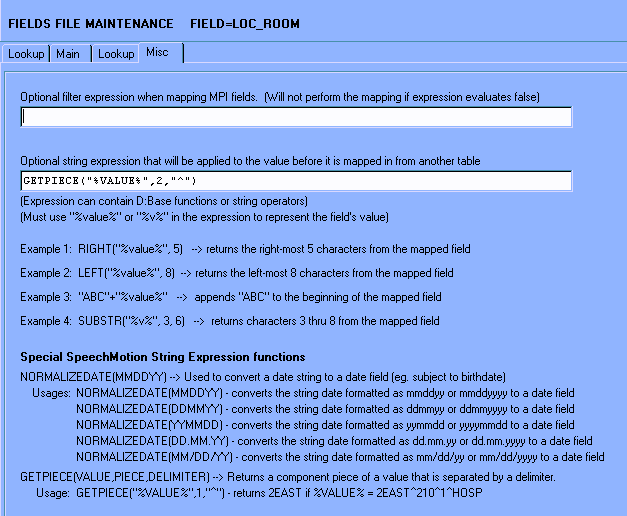 Usage: Assume a field with a value of 2East^210^1^Hosp. GETPIECE(“%VALUE%”,1,”^”) would return the value 2East and GETPIECE(“%VALUE%”,2,”^”) would return the value 210. The first parameter should always be “%VALUE%” or “%V%”, including the quotes.