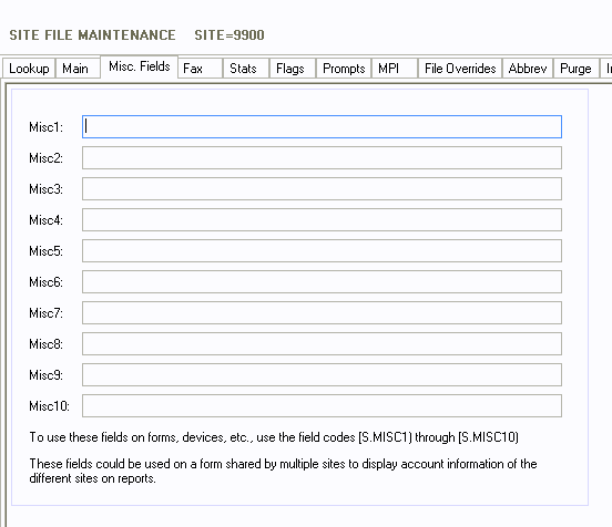 These fields are available in Site File Maintenance on a new Misc. Fields tab.