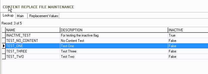 The new Content Replace File Maintenance has three tabs: